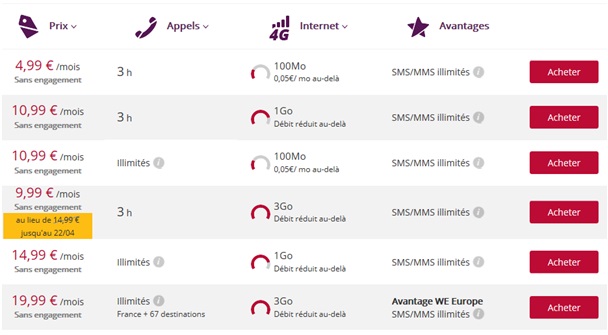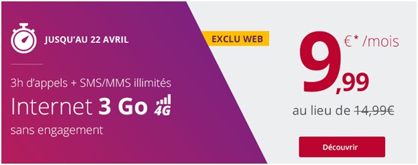 Remise prolongée jusqu'au 22 Avril, le forfait avec 3h + 3Go en 4G en promo à 9.99€ par mois !