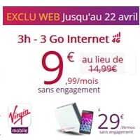 Virgin Mobile prolonge la remise de 5€ valable à vie pour son forfait 3h + 3Go en 4G disponible sans engagement ou avec achat de Smartphone et engagement de 24 mois jusqu’au 22 Avril prochain. Cette offre est au prix de 9.99€ au lieu de 14.99€ sans engagement ou encore 19.99€ au lieu de 24.99€ avec engagement de 24mois. L’abonnement intègre 3h de communications par mois vers les fixes et les mobiles en France ainsi que les SMS et MMS illimités et un accès Internet de 3Go en 4G avec une réduction de débit au-delà du volume autorisé.