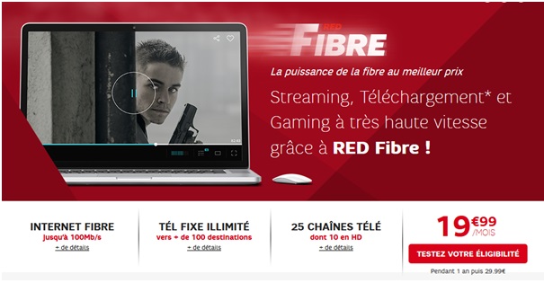 Il est également possible de souscrire à l’offre Fibre sans forfait mobile en promo en ce moment à 19.99 pendant 12 mois au lieu de 29.99€. Cette offre est disponible selon éligibilité technique et géographique et la remise est non cumulable avec la réduction abonné Red Fibre + Mobile.