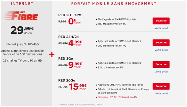 -La série RED 3Go avec les appels illimités vers les mobiles et fixes de France, d'Amérique du Nord et des DOM (hors Mayotte) et vers les fixes de 52 destinations, SMS et MMS illimités en France et 3Go de data en 4G est également proposée avec une offre Internet Fibre au prix de 39.98€.