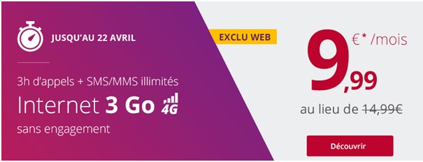 Le forfait avec 3h + 3Go en 4G en promo à partir de 9.99€ par mois jusqu’au 22 Avril !