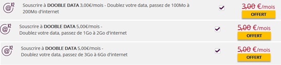 Pour rappel, l’option Dooble data en dehors de l’opération lancée par Virgin Mobile jusqu’au 14 Mai 2015 est facturée 3€ par mois avec les forfaits mobiles avec un accès Internet de 100Mo et 5€ par mois avec les forfaits avec 1Go de data ou plus.