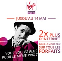Virgin Mobile vous offre l’option Dooble Data avec tous ses forfaits mobiles. Cette option facturée 3€ ou 5€ en fonction de l’offre choisie est gratuite jusqu’au 14 mai 2015 et vous permet de doubler le volume internet de votre abonnement. Quelque soit vos usages mobiles, les différentes offres proposées chez l’opérateur répondent aux besoins de tous, avec des forfaits avec 3h d’appels, des appels illimités, des usages data compris entre 200Mo et 6Go avec la promotion. La 4G est incluse avec toutes les formules de l’opérateur avec le réseau SFR qui couvre plus de 40% de la population Française.