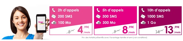 Budget Mobile relance son forfait 5h avec 300 SMS et 300Mo au prix de 9.99€ par mois. La formule 30Min à 1.99€ par mois quant à elle disparait du catalogue de l’opérateur. Désormais trois formules sont commercialisés à partir de 5.99€ avec 2h d’appels jusqu’au forfait avec 10h de communications par mois à 14.99€ par mois. Toutes les offres proposées chez l’opérateur sont sans engagement et Budget Mobile utilise le réseau SFR.