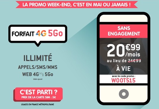 NRJ Mobile a lancé une opération spéciale Week-ends de Mai la semaine dernière et comme prévu entre le 07 et 10Mai prochain, le forfait 4G sans engagement avec 5Go de data est en promo. L’opérateur vous offre une remise de 4€ par mois valable à vie soit la formule illimitée avec 5Go d’internet à 20.99€ au lieu de 24.99€ par mois. Pour profiter de la réduction de 4€ par mois sur le forfait 4G 5Go, vous devez indiquer le code promo « WOOT515 » lors de l’inscription.