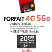 Le forfait Woot 3Go est l’un moins chers du marché au prix de 15.99€ par mois avec les appels, SMS et MMS illimités en France. Pour vos usages internet, le volume inclus est de 3Go en 4G au-delà le débit est réduit jusqu’à la prochaine date de facturation. Les appels sont illimités dans la limite de 3h par appel et 129 destinataires différents maximum/mois