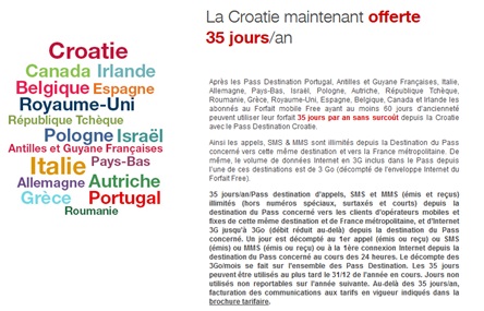 Le Pass Destination est valable après 60 jours d’ancienneté au Forfait Free illimité, vous profitez des appels, SMS/MMS (émis et reçus) en illimité et un accès Internet 3Go (décompté de l’enveloppe Internet du Forfait Free). Le roaming est disponible 35 jours par an et par Pass depuis la Destination du Pass concerné vers cette même destination et vers la France métropolitaine. Au-delà des 35 jours, les communications voix, SMS, MMS et Internet sont facturées aux tarifs en vigueur indiqués