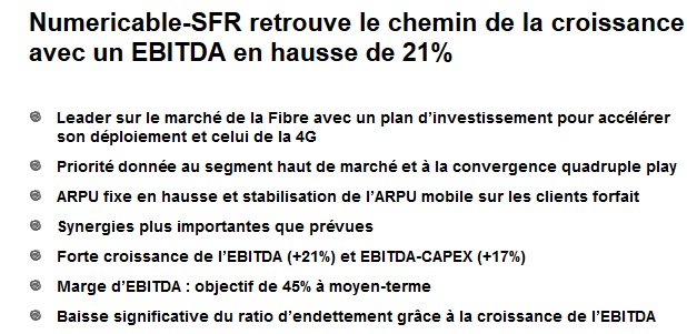 Pour 2015, Numericable-SFR a pour objectif d’atteindre 20% de croissance de l’EBITDA ajusté1 et de générer un EBITDA-CAPEX compris entre 1,9 et 2 milliards d’euros. Numericable-SFR augmente son objectif en termes de marge d’EBITDA à moyen terme à plus de 45%.