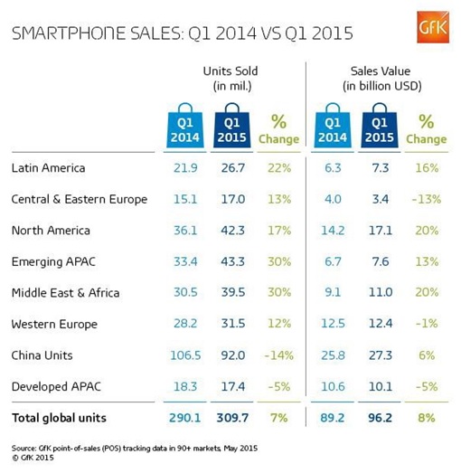 En Europe de l’Ouest, les volumes progressent de +12%, mais baissent de -1% en valeur. Le premier trimestre 2015 a également été marqué par une forte demande vers des écrans plus grands (supérieur à 5 pouces) comme l’iPhone 6 Plus et son écran 5.5 pouces.