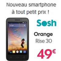 Sosh commercialise un nouveau Smartphone Low Cost l’Orange Rise 30 à 49€, ce mobile est idéal pour équiper vos ados d'un premier Smartphone avec un forfait sans engagement à partir de 4.99€ par mois. Le mobile est envoyé gratuitement sous 72h après validation de la commande par l’opérateur.