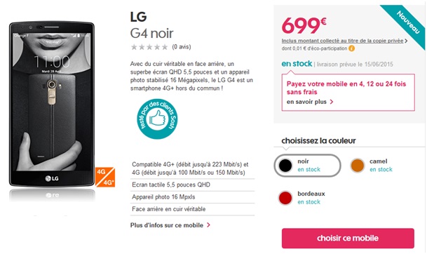 Le LG G4 est proposé au tarif de 699 chez la marque Low Cost d’Orange. Ce Smartphone compatible 4G est équipé d’un processeur Hexa Core 1,8 Ghz (MSM8992) accompagné de 3 Go de mémoire vive et une capacité de stockage de 32 Go extensible via l'ajout d'une carte microSD (jusqu'à 128 Go supplémentaires). Ce LG fonctionne sous Android 5.1 Lollipop et est doté d’un écran tactile de 5.5’QHD. Le mobile embarque un appareil photo de 16mégapixels à l'arrière, avec stabilisation optique et mise au point 'Laser et d’un capteur de 8megapixels à l’avant. Ce LG dispose du Wi-Fi a/b/g/n/ac double-bande, du Bluetooth 4.1 et du NFC. La capacité de la batterie amovible est de 3 000 mAh. Le design légèrement incurvé du G4 offre une prise en main plus confortable et une meilleure ergonomie. Ses dimensions sont 148.9x76.2x9.8 mm pour un poids de 155G. Son niveau d’exposition DAS est de 0.618 W/kg.