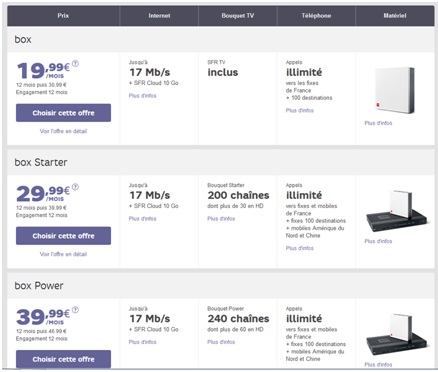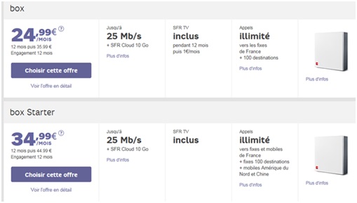 Les offres Box ADSL en Zone non dégroupée sont toujours disponibles mais avec cette fois un engagement de 12 mois. Le prix reste le même pour l’offre BOX de SFR et la formule Starter baisse de prix, la TV sur Smartphone et PC facturée 1€ est désormais incluse soit l’abonnement à 44.99€ au lieu de 45.99€. Ces deux offres sont en promo pendant 12 mois au prix de 24.99€ ou encore 34.99€ pour la formule Starter.