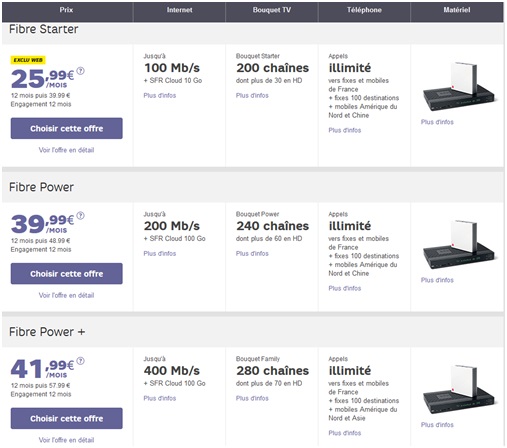 -Box Fibre Power+ : 400 Mb/s + bouquet TV Family de 280 chaînes en promo à 41,99 € par mois pendant 1 an puis 57,99€ par mois. Pour ceux qui peuvent profiter d’un débit jusqu’à 1Gb/s, SFR propose désormais l'option 'Booster de débit' à 2€ par mois.