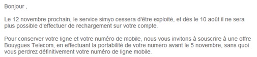 Les clients sont dès à présents avertis par email de la cessation de l’activité de Simyo en Novembre prochain et sont invités dès à présent à basculer vers une offre Bouygues Telecom prépayée ou forfait. La démarche devra être effectuée avant le 05 Novembre prochain. Les abonnés peuvent aussi choisir de basculer vers un autre opérateur mobile.