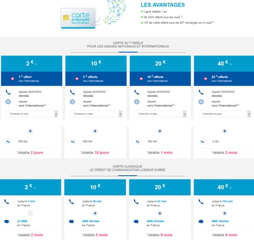 Vous êtes habitué à la solution prépayée, Bouygues Telecom commercialise la carte prépayée avec des recharges XL idéales pour les usages nationaux et internationaux ou encore les recharges classiques. La ligne est valable 1 an et les montants des recharges varient entre 2€ et 40€ et la durée de validité du crédit varie entre 2 jours et 6 mois.