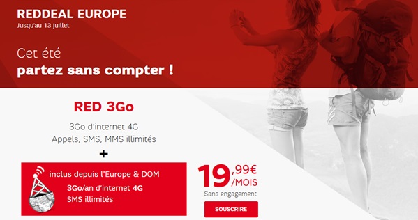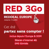 #REDDEAL Europe est le nouvel avantage proposé avec la série RED 3Go à 19.99€ par mois sans engagement depuis le 30 juin 09h. Jusqu’au 20 juillet, vous profitez de 3Go de data ainsi que les SMS illimités depuis l’Europe et les DOM sans aucun surcoût pour toute souscription à la formule RED 3Go. L'option REDDEAl Europe gratuite est valable uniquement pour les 10.000 premières nouvelles souscriptions ou migrations vers un forfait RED 3Go (hors Clients RED 3Go ayant souscrit avant le 30/06/2015, RED 5Go et client mobile SFR encore engagés) entre le 30/06/2015 à 9h et le 13/07/2015 à 8h59. L'opérateur vient de mettre à jour ses offres mobiles RED le 07 juillet et l'opération RED DEAL Europe est finalement repoussée jusqu'au 20 juillet prochain.