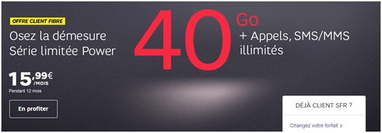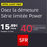La série Limitée Power 40Go de data chez SFR est réservée aux abonnés Fibres, l’offre est également disponible pour les clients ADSL mais avec 20Go de data au lieu de 40Go. Ce nouveau forfait avec 40Go de data est disponible chez SFR à partir de 35.99€ pour les clients Fibres avec engagement de 12 mois ou encore au prix de 45.99€ sans engagement ou avec engagement de 24 mois et achat de Smartphone sans la remise abonnés SFR BOX de 10€ par mois.