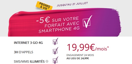 Rappelons que le forfait 3h d’appels, SMS/MMS Illimités, Internet 3Go en 4G au prix de 24.99€/mois avec engagement 24 mois est actuellement en promo et ce jusqu’au 21 juillet à 19.99€ par mois, un prix valable à vie.
