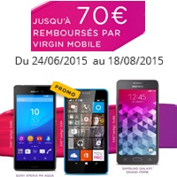 Virgin Mobile vous offre jusqu’à 70€ pour l’achat d’un Smartphone avec la souscription à un forfait avec engagement de 24 mois. La promotion est valable sur tous les mobiles présentés dans le catalogue de l’opérateur (hors mobiles reconditionnés) et ce jusqu’au 18 Août 2015.