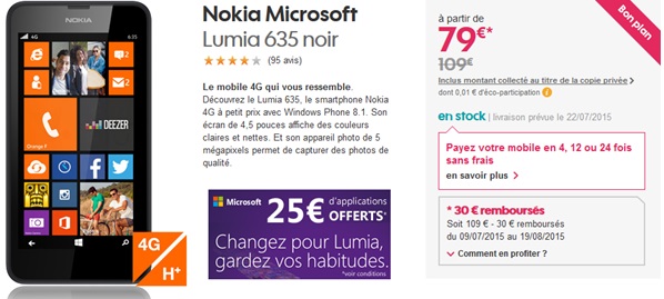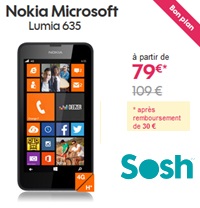 Sosh vous offre une remise différée de 30€ pour l’achat du Lumia 635 4G avec la souscription simultanée à un forfait 4G sans engagement de l’opérateur et à condition de rester client minimum 2 mois. Le Smartphone est au prix de 109€ soit 79€ avec la promotion valable jusqu’au 22 Août prochain.