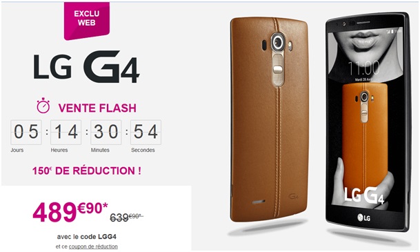 -Remise immédiate de 100€ jusqu’au 29 juillet 2015, pour en bénéficier, il suffit d’indiquer le code promo 'LGG4' dans le champ prévu lors de la commande,