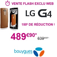 Le LG G4 est en vente flash jusqu’au 29 juillet prochain chez Bouygues Telecom, l'opérateur vous offre jusqu'à 150€ pour l’achat de ce Smartphone nu ou avec un forfait B&You sans engagement à partir de 3.99€ en exclu Web. Le mobile vous revient ainsi à 489.90€ au lieu de 639.90€ en cumulant les deux promotions disponibles actuellement chez l'opérateur.