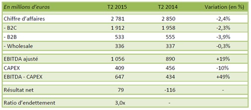 Le désendettement du Groupe s’est poursuivi au deuxième trimestre avec un ratio de 3,0x et ce, en dépit du rachat et de l’annulation de 10% des actions détenues par Vivendi en mai. Cette stabilisation du ratio d’endettement par rapport au premier trimestre 2015 a été réalisée grâce à la forte croissance de l’EBITDA ajusté et à l’amélioration continue du flux de trésorerie disponible.