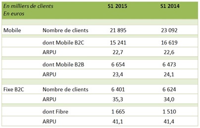 En voie de stabilisation au premier trimestre, l’ARPU (revenu moyen par abonné) mobile repart à la hausse à 26,1€ en augmentant de 0,4% par rapport au 2ème trimestre 2014. Il suit le chemin de l’ARPU fixe qui continue sa progression avec un ARPU à 35,3€ en hausse de 3,8% sur un an et dont l’ARPU d’acquisition est 9% supérieur à celui de la base. La stratégie marketing portée sur la création de valeur grâce à une orientation claire sur les clients à valeur et les offres quadruple play s’applique désormais au Mobile comme au Fixe.