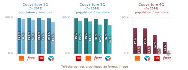 Les taux de couverture ci-dessous expriment une couverture à l'extérieur des bâtiments et ont été calculés à partir des dernières cartes de couverture vérifiées sur le terrain, sous le contrôle de l'ARCEP. Elles datent de fin 2013 s'agissant de la 2G, et fin 2014 s'agissant de la 3G et de la 4G. Il faut rappeler que ces informations sont représentatives du service délivré aux utilisateurs, et non du seul réseau appartenant à l'opérateur concerné : la couverture affichée tient compte des accords de mutualisation et d'itinérance passés avec d'autres opérateurs.