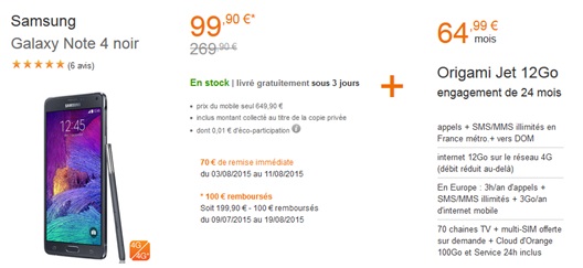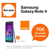 Le Samsung Galaxy Note 4 est en promo à partir de 59.90€ au lieu de 229.90€ grâce à la vente flash proposée par Orange entre le 03 et 11 Août prochain. La remise immédiate de 70€ en exclu Web est automatique et valable pour toute souscription au forfait Origami Jet 12Go 4G à 64.99€ avec un engagement de 24 mois chez Orange. L’offre de remboursement différé de 100€ est valable jusqu’au 19 Août 2015, et interviendra automatiquement à partir de votre troisième facture.