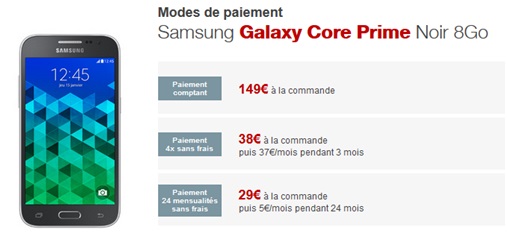 Le Samsung Galaxy Core Prime à 29€ à la commande puis 5€ par mois avec le paiement en 24fois sans frais, ce Smartphone est également disponible au prix de 149€ à la commande ou encore en 4 fois sans frais avec une première mensualité de 38€ à régler à la commande puis 37€ 3 fois.