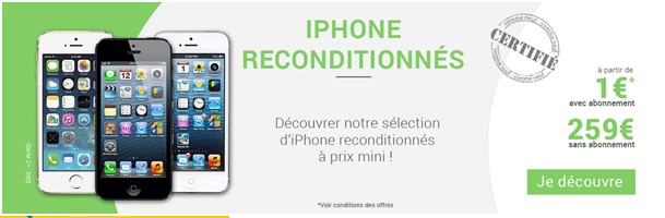 - iPhone 5 16Go reconditionné à partir de 149€ avec un forfait Idéal Smartphone 4Go à partir de 39.80€, 449€ avec un forfait sans engagement à partir de 3.50€ ou encore 459€ sans abonnement, profitez sur ce modèle d’une offre de remboursement différée de 100€ quelque soit le type de formule choisie.