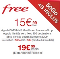 Le forfait illimité Free Mobile est au prix de 19.99€ ou 15.99€ pour les abonnés Freebox. Cet abonnement comprend les appels illimités vers les fixes et les mobiles en France métropolitaine, Etats-Unis, Canada, Alaska, Hawaï, Chine, DOM (Guadeloupe, Guyane française, Martinique, Mayotte et La Réunion) et vers les fixes de 100 destinations internationales*. Vous profitez également des SMS illimités en France et vers les DOM ainsi que les MMS illimités en France ainsi que les SMS illimités depuis l'Europe et les DOM vers la France. Les connexions à Internet sont possibles avec un volume qui varie entre 3Go ou 20Go en fonction de votre équipement (Smartphone 4G). Le volume est désormais de 50Go par mois dans le cas ou vous détenez un mobile 4G et sur le réseau 4G sinon le volume data est ramené à 3Go en 3G (débit réduit au-delà). L'accès aux hotspot Free est disponible en illimité.