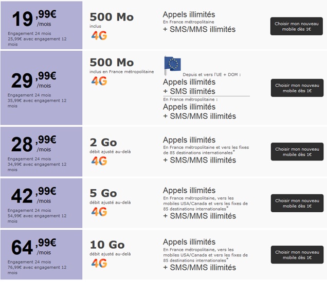 Toutes ces formules intègrent les appels, SMS et MMS illimités en France, le volume data varie entre 500Mo et 10Go en 4G selon le forfait choisi. Le débit est réduit au-delà du volume autorisé, et bloqué pour l’abonnement Europe 500Mo à partir de 29.99€ par mois.