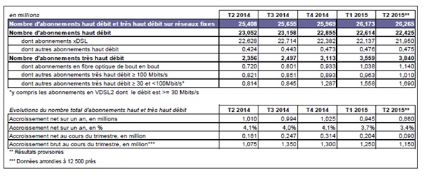 Au 30 juin 2015, le nombre d'abonnements internet sur réseaux fixes atteint 26,3 millions, soit une croissance nette de 90 000 abonnements au cours du trimestre et de +3.4% en un an. Les offres très haut débit progressent de +1.5 million en un an, le nombre d’abonnements est évalué à 3,8 millions à la fin du deuxième trimestre 2015 (+280 000 en un trimestre).