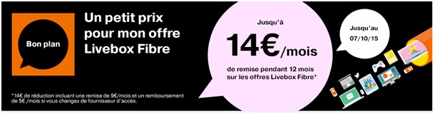 Orange met en avant ses offres Fibres ou par ADSL jusqu'au 07 octobre prochain, l'opérateur vous offre jusqu'à 14€ de remise par mois et ce pendant 12 mois (réduction automatique de 9€ pour toute souscription via Internet et 5€ de plus par mois dans le cadre d'un changement d'opérateur).