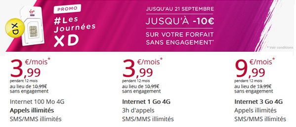Les journées XD, c’est des réductions jusqu’à 10€ par mois et ce pendant 12 mois sur trois forfaits 4G de Virgin Mobile disponibles sans engagement ou avec achat de mobile et engagement de 24 mois. Cette opération lancée à l’occasion de la rentrée se termine le 21 Septembre prochain, il vne vous reste donc plus que quelques heures pour profiter des promos suivantes :