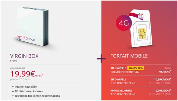 -34.99€ par mois pendant 12 mois puis 44.99€, un pack qui intègre la Virgin Box avec ou sans TV et un forfait mobile avec les appels illimités en France et vers les fixes de 67 destinations internationales, SMS et MMS illimités, un avantage le Week-end depuis l’Europe et les DOM et 20Go de data en 4G.