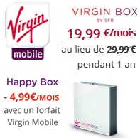 Virgin Mobile attribue une remise de 4.99€ par mois pour les nouveaux clients Box et Mobile et les clients mobiles déjà existants souscrivant à la Virgin Box. Cette promotion est appliquée pour toute souscription à l’offre Virgin box by SFR (en promo actuellement au prix de 19.99€ par mois et ce pendant 12 mois) pour les titulaires d’un abonnement (même nom, même prénom, même adresse) de téléphonie mobile Virgin Mobile dont le montant de l’abonnement mensuel hors réduction est supérieure à 4€/mois, sous réserve que la ligne Virgin box et la ligne mobile associée soient toutes deux actives (ni suspendues ni résiliées) et sous réserve d’être à jour dans le règlement de ses factures pour les lignes concernées. La résiliation (par le client ou par Virgin Mobile) de la Virgin box entraîne immédiatement la perte de la remise sur la ligne Virgin Mobile.