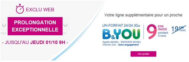 Pour les autres formules disponibles chez l’opérateur tels que le forfait 24/24 + 5Go à partir de 29.99€ par mois ou encore le forfait 24/24 + 10Go à partir de 39.99€ par mois et le forfait 24/24 +40Go à partir de 69.99€ par mois, sachez qu’une remise de 10% est appliquée dès la seconde ligne détenue chez l’opérateur (détenteur d’un forfait B&You, d’un forfait Sensation ou d’une Bbox)