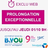 Bouygues Telecom vous offre une remise de 50% sur une sélection de forfaits avec ou sans engagement dès la deuxième ligne détenue et ce pendant 6 mois depuis le 24 Août dernier. Cette opération censée se terminer ce matin 27 septembre est prolongée jusqu'au 01 octobre 2015, voici un rappel des offres concernées :