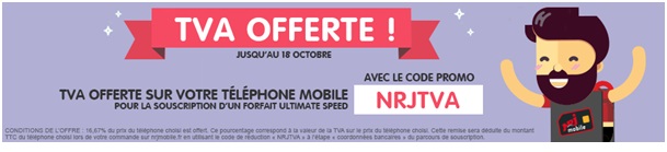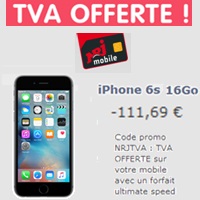 NRJ Mobile offre la TVA sur votre nouveau Smartphone jusqu’au 18 octobre 2015, grâce à cette opération vous profitez jusqu’à 112€ sur l’iPhone 6S. Cette promotion est valable sur tous les téléphones disponibles chez l’opérateur et avec la souscription à un forfait Ultimate Speed avec engagement minimum de 12mois. Pour profiter de la réduction, il suffit d’indiquer le code promo «« NRJTVA » lors de la souscription à l’étape coordonnées bancaires.