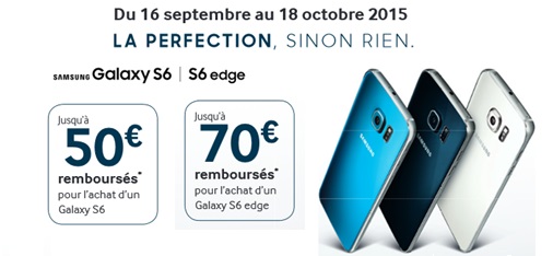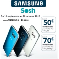 L’offre de remboursement jusqu'à 70€ pour l’achat d’un Samsung Galaxy S6 Edge ou Galaxy S6 avec un forfait Sosh est disponible jusqu’au 18 octobre 2015. Grâce à cette promotion, le Samsung Galaxy S6 est au prix de 549€ avec la remise différée de 50€ au lieu de 589€ et le Samsung Galaxy S6 Edge au prix de 629€ au lieu de 679€ avec l'offre de remboursement de 70€. Pour le règlement de votre nouveau Smartphone, sachez que Sosh propose le paiement au comptant ou encore en 4, 12 ou 24 fois sans frais.