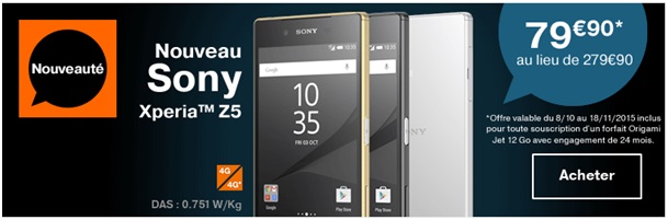 Orange vous offre jusqu’à 200€ jusqu’au 18 Novembre 2015, pour l’achat du tout dernier Sony Xperia Z5 avec la souscription simultanée à un forfait Origami avec engagement de 12 mois minimum. Ce mobile est ainsi disponible à partir de 79.90€ au lieu de 279.90€. On note également une baisse de prix sur ce Sony avec les forfaits Origami Play 8Go et 4Go en comparant son tarif lors du lancement des précommandes le 28 septembre dernier chez Orange.