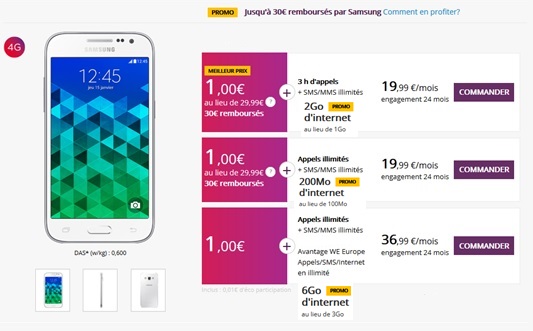 Le Samsung Galaxy Core Prime est au prix de 1€ au lieu de 29.99€ avec un forfait 24/24 + 200Mo avec engagement de 24 mois ou encore le forfait 3H + 2Go. Samsung vous rembourse jusqu’à 30€ pour l’achat de ce Smartphone avant le 31 décembre 2015. Il vous faudra suivre les instructions de ce coupon et envoyer le dossier complet avant le 15 janvier 2015. Le remboursement interviendra dans les 10 semaines à compter du 15 janvier 2016 sur le compte correspondant au RIB que vous allez fournir.