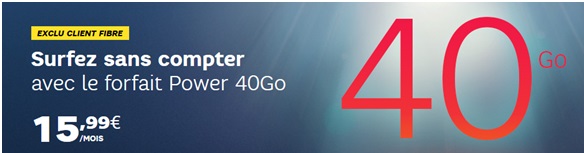 Le forfait Power 40Go de data chez SFR est réservée aux abonnés Fibres, l’offre est également disponible pour les clients ADSL mais avec cette fois un volume de 20Go pour vous connecter à Internet via votre Smartphone. Cette offre avec 40Go de data en 4G en promo à partir de 15.99€ par mois vient directement concurrencer la formule Free avec 50Go de data à 15.99€ par mois pour les abonnés Free Box.