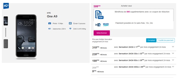 -461.90€ avec un forfait Sensation 24h/24 + 10Go à 49.99€ par mois, (-100€ déduits dès la troisième facture soit le HTC ONE A9 à 361.90€)