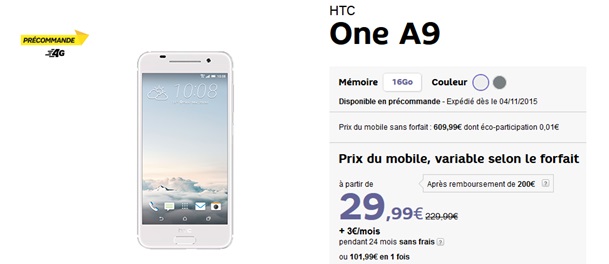 Le HTC ONE A9 disponible également en précommande chez SFR depuis le 23 octobre au prix de 599.90€ avec un forfait sans engagement RED ou SFR à partir de 4.99€ par mois. En choisissant un forfait avec subvention chez SFR, le HTC ONE A9 est disponible à partir de 109.99€ avec la remise différée de 200€ et la souscription simultanée à un forfait Power 15Go actuellement en promo à 84.99€ pendant 1 an via le Web.