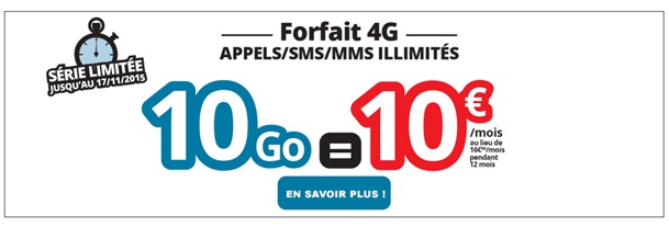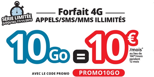 Le groupe EI Telecom fêtera ses 10ans d’existence le 02 Novembre prochain et à cette occasion, un forfait inédit avec appels, SMS et MMS illimités avec 10Go de data en 4G, sans engagement est actuellement proposé chez les marques appartenant au groupe. L’offre 10Go à 10€ est disponible depuis le 19 octobre et ce jusqu’au 15 Novembre 2015 chez NRJ Mobile et depuis le 21 octobre et ce jusqu’au 17 octobre 2015 chez Auchan Telecom.