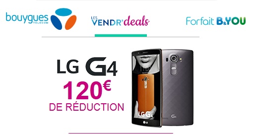 Depuis ce matin à 9H, Bouygues Telecom vous propose une vente flash, non pas sur un forfait cette-ci fois, mais sur un smartphone haut de gamme qu'est le LG G4 ! 120€ de remise vous seront ainsi attribués pour toute commande entre aujourd’hui et mercredi 28/10 à 9H sur ce modèle.